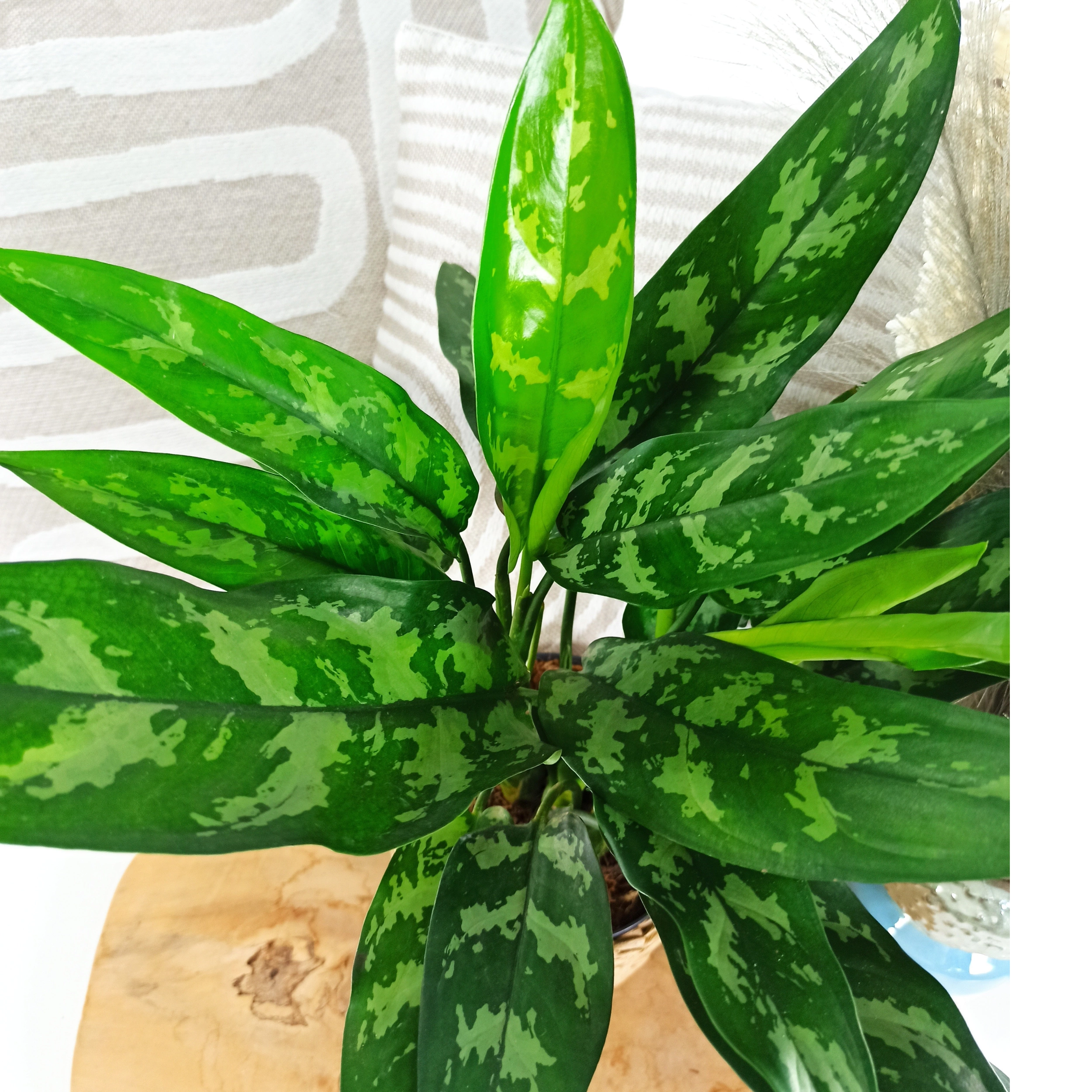Aglaonema Maria besticht durch große, glänzende grüne Blätter mit creme-weißen Mustern und zarten rosa Akzenten. Die ovalen Blätter bilden einen kompakten, buschigen Wuchs und fügen sich hervorragend in moderne und klassische Räume ein, verleihen ihnen exotischen Charakter und Frische.