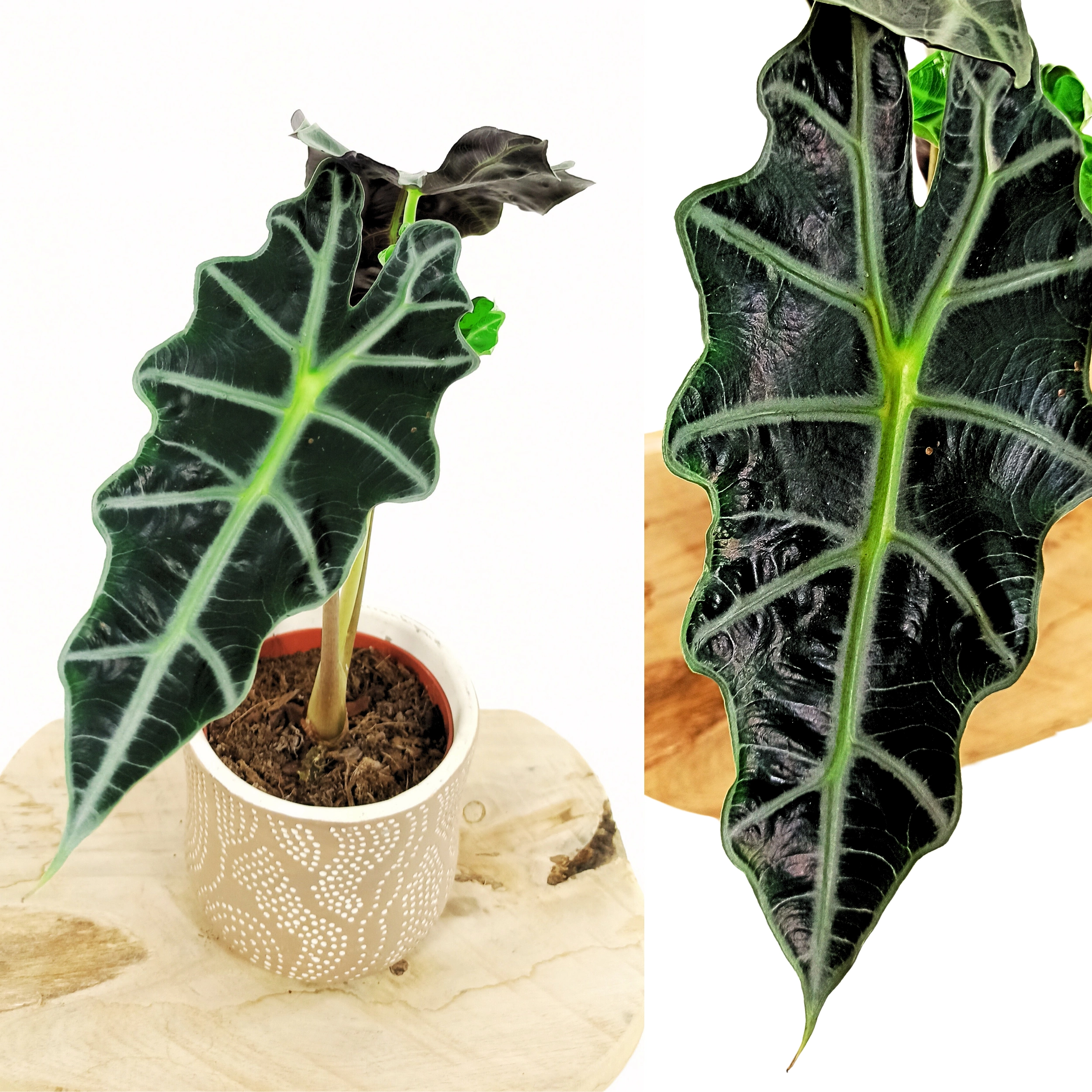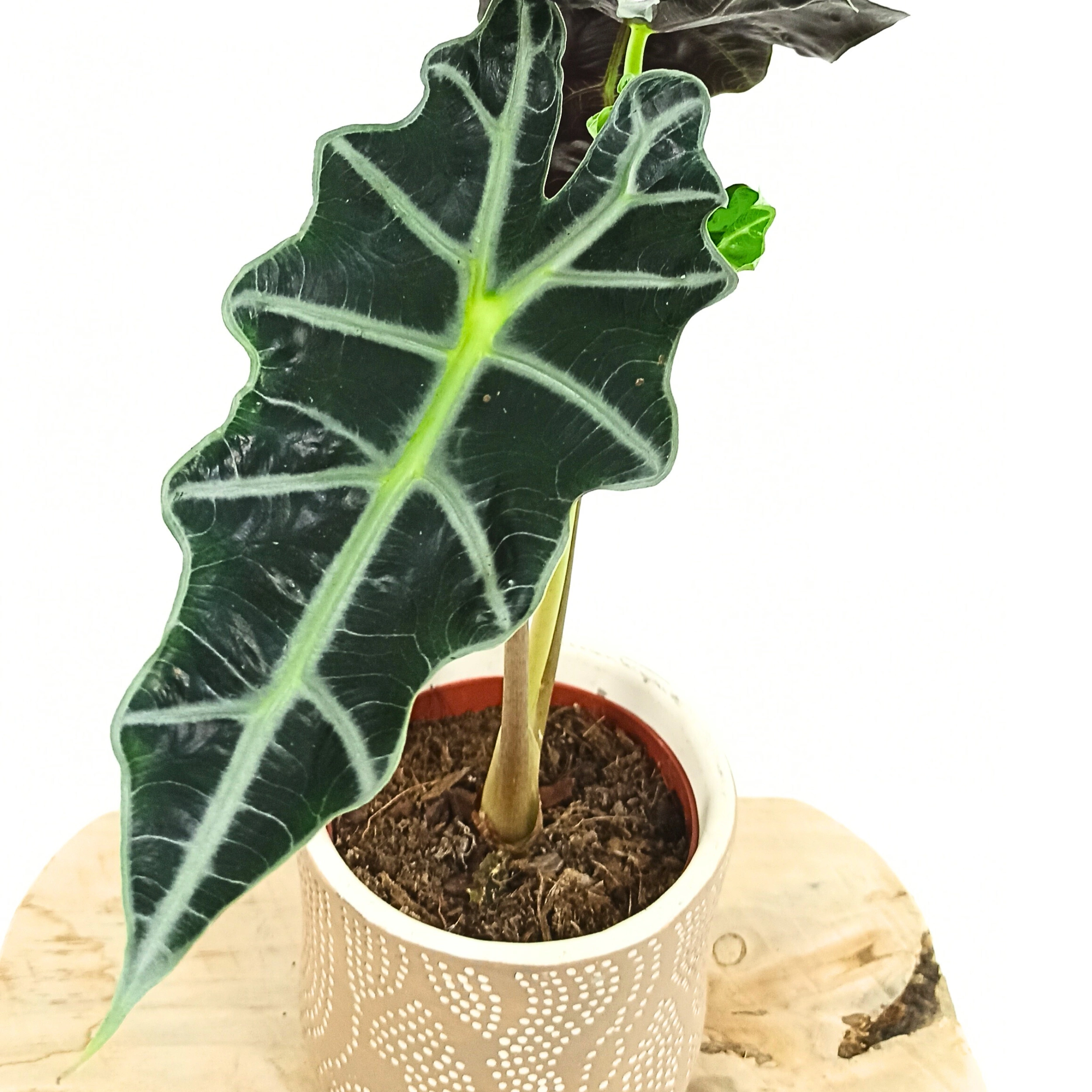 Alocasia Polly ist eine besondere Zimmerpflanze, die mit ihren dekorativen Blättern begeistert. Die dunkelgrünen, herzförmigen Blätter zeigen markante helle Adern, was der Pflanze ein modernes und exotisches Aussehen verleiht. Sie wächst etwa 40–60 cm hoch und eignet sich gut für Wohnungen und Büros.