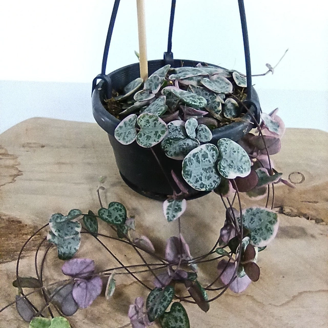 Ceropegia woodii variegata ist eine markante Kletterpflanze mit langen, dünnen Trieben und herzförmigen Blättern, die unregelmäßige cremefarbene, hellrosa und grüne Flecken aufweisen. Diese Sorte besticht nicht nur durch ihre Form, sondern auch durch ihr einzigartiges marmoriertes Blattmuster, das ihr eine leichte und elegante Ausstrahlung verleiht. Im Sommer erscheinen zarte, röhrenförmige Blüten in einem dezenten Rosa-Violett, die der Pflanze zusätzlichen Charme verleihen.