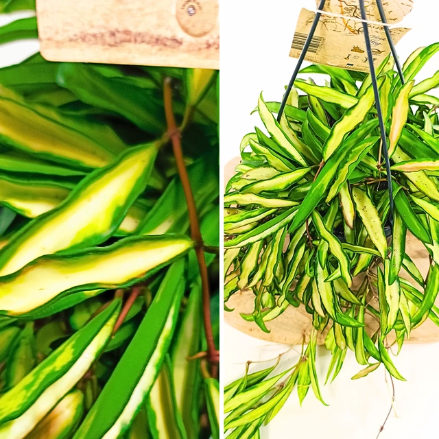 Hoya wayetii tricolor ist eine exotische Kletterpflanze mit einzigartigem Muster auf den Blättern, die Flecken und Streifen in Grün, Creme und Rosa zeigen und damit eine außergewöhnliche dekorative Wirkung erzielen. Die Blätter sind schmal, fleischig und leicht gewellt am Rand, was der Pflanze eine zarte und luftige Erscheinung verleiht. Die Blüten sind klein, wachsartig, weiß mit rosa Akzenten und erscheinen sporadisch, aber das Laub ist der Hauptanziehungspunkt.